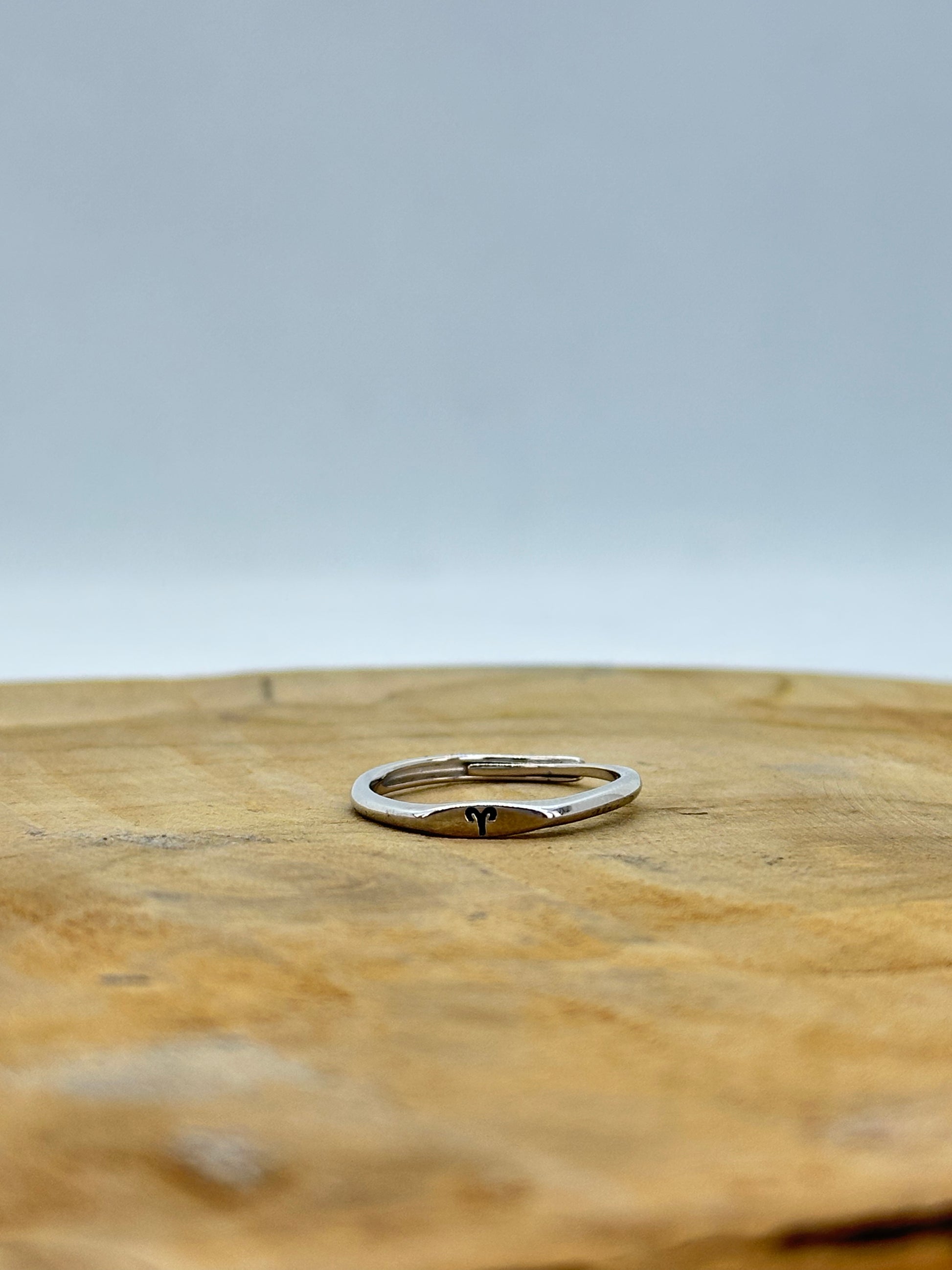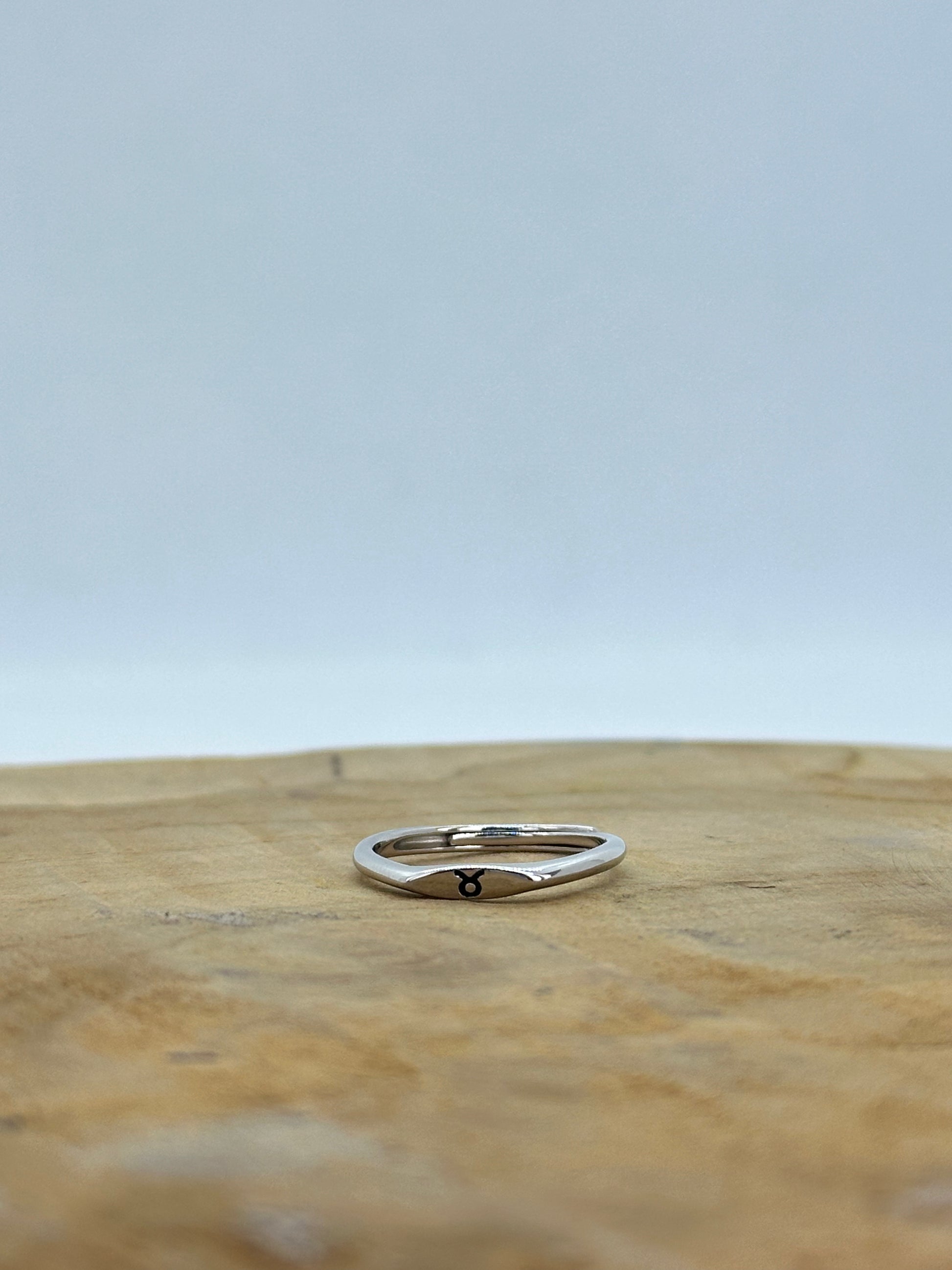 Chaque bague est gravée du symbole d’un signe du zodiaque, pour un bijou à la fois discret et personnel.