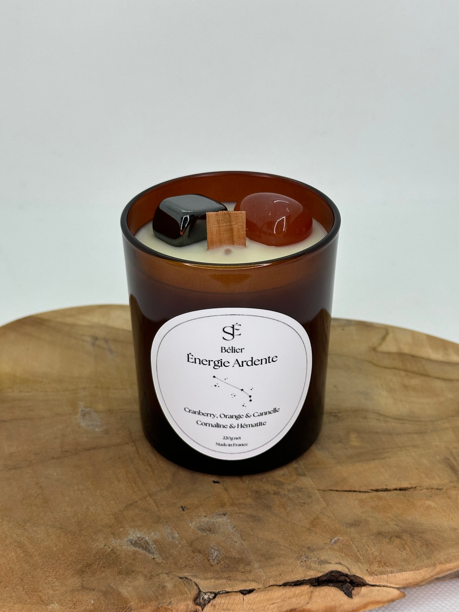 Une bougie dynamique qui reflète la force et la passion du Bélier. La Cornaline stimule la créativité et l’Hématite apporte stabilité et ancrage. Son parfum fruité et épicé réveille les sens et donne l’élan d’agir.