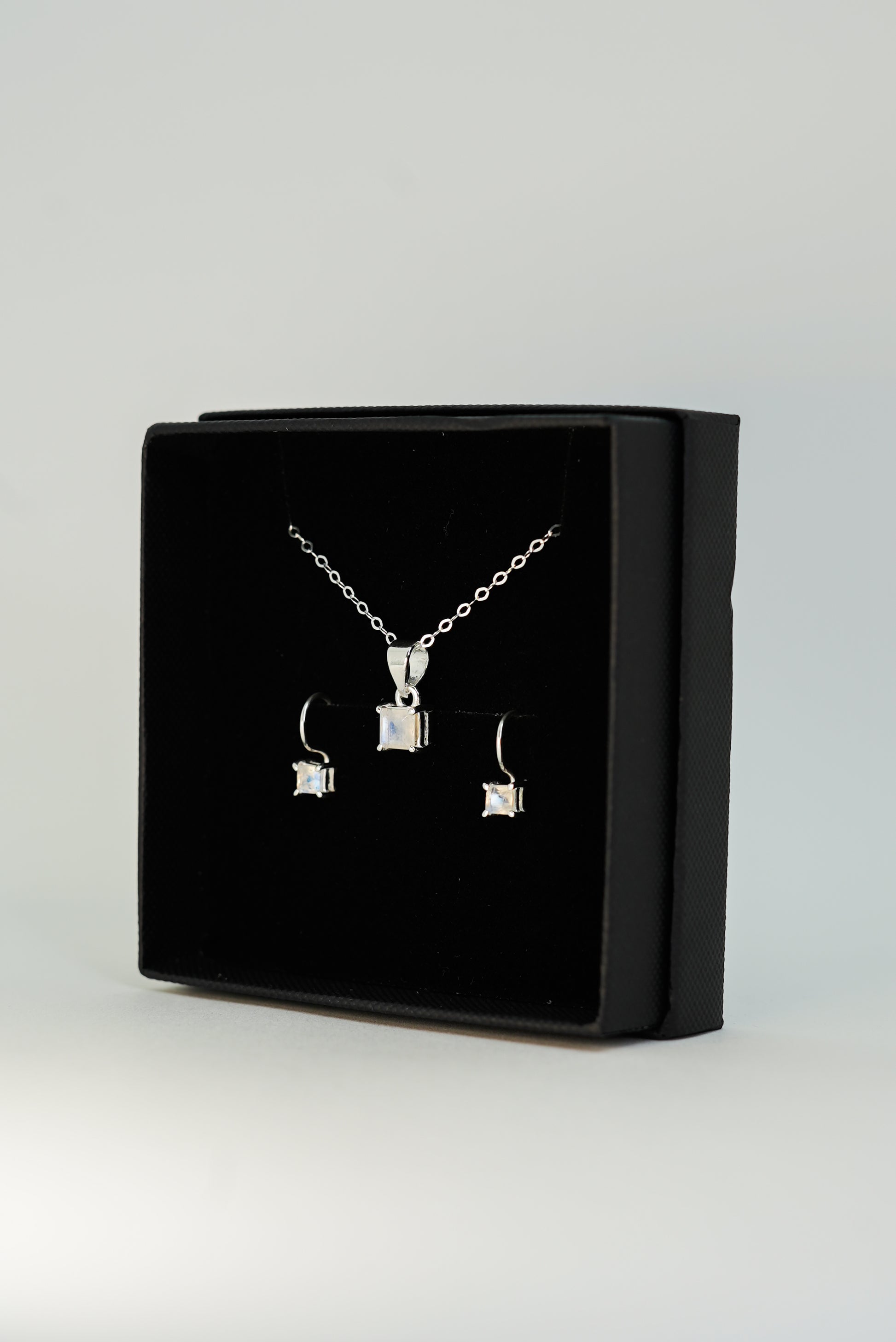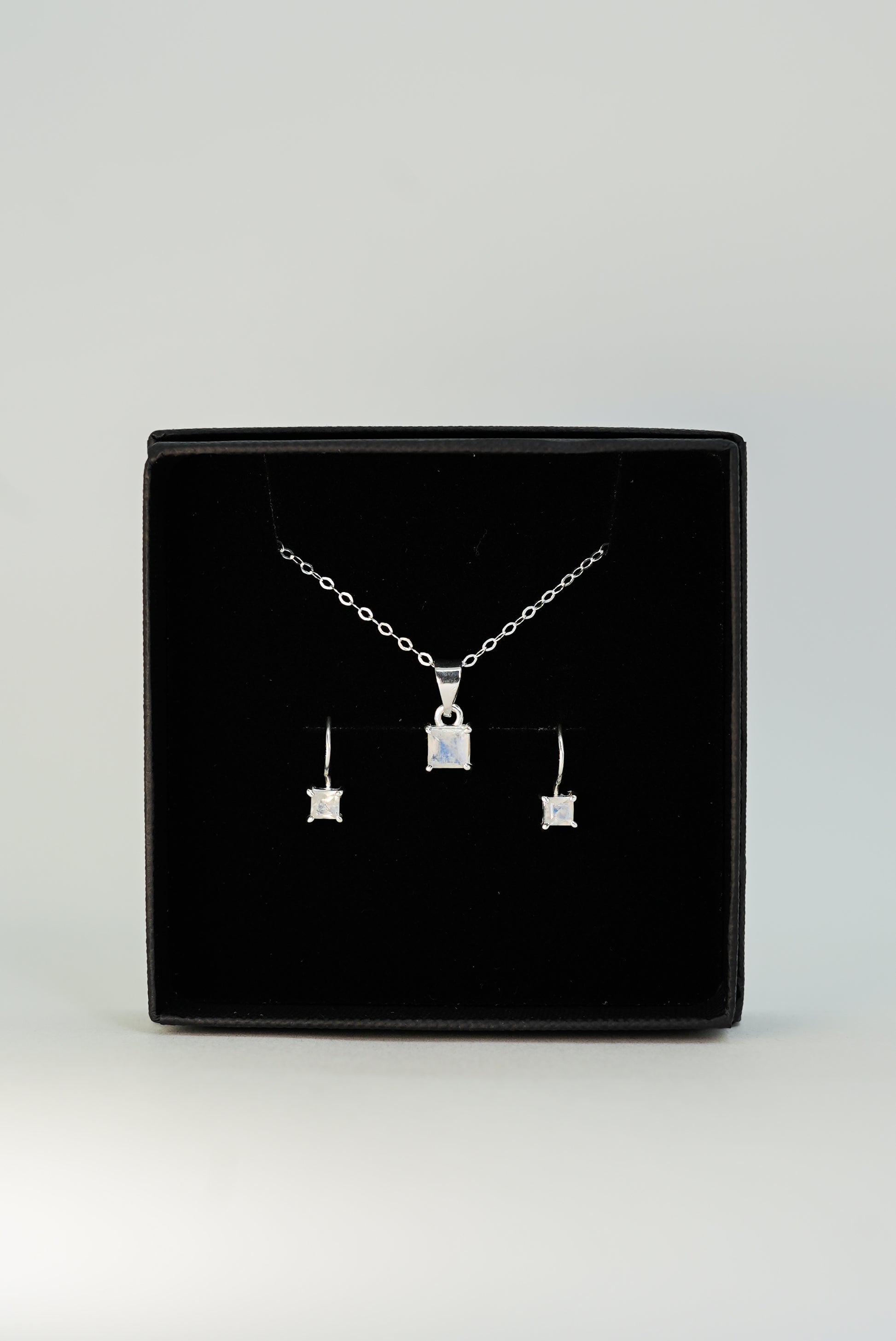 Ce magnifique set se compose d’un pendentif et d’une paire de boucles d’oreilles sertis de pierres de lune arc-en-ciel naturelles, taillées en carré facetté. Montées sur de l’argent massif 925, ces pierres aux reflets bleutés et irisés diffusent une aura mystérieuse et lumineuse. Un ensemble raffiné, idéal pour illuminer vos tenues avec élégance et subtilité.