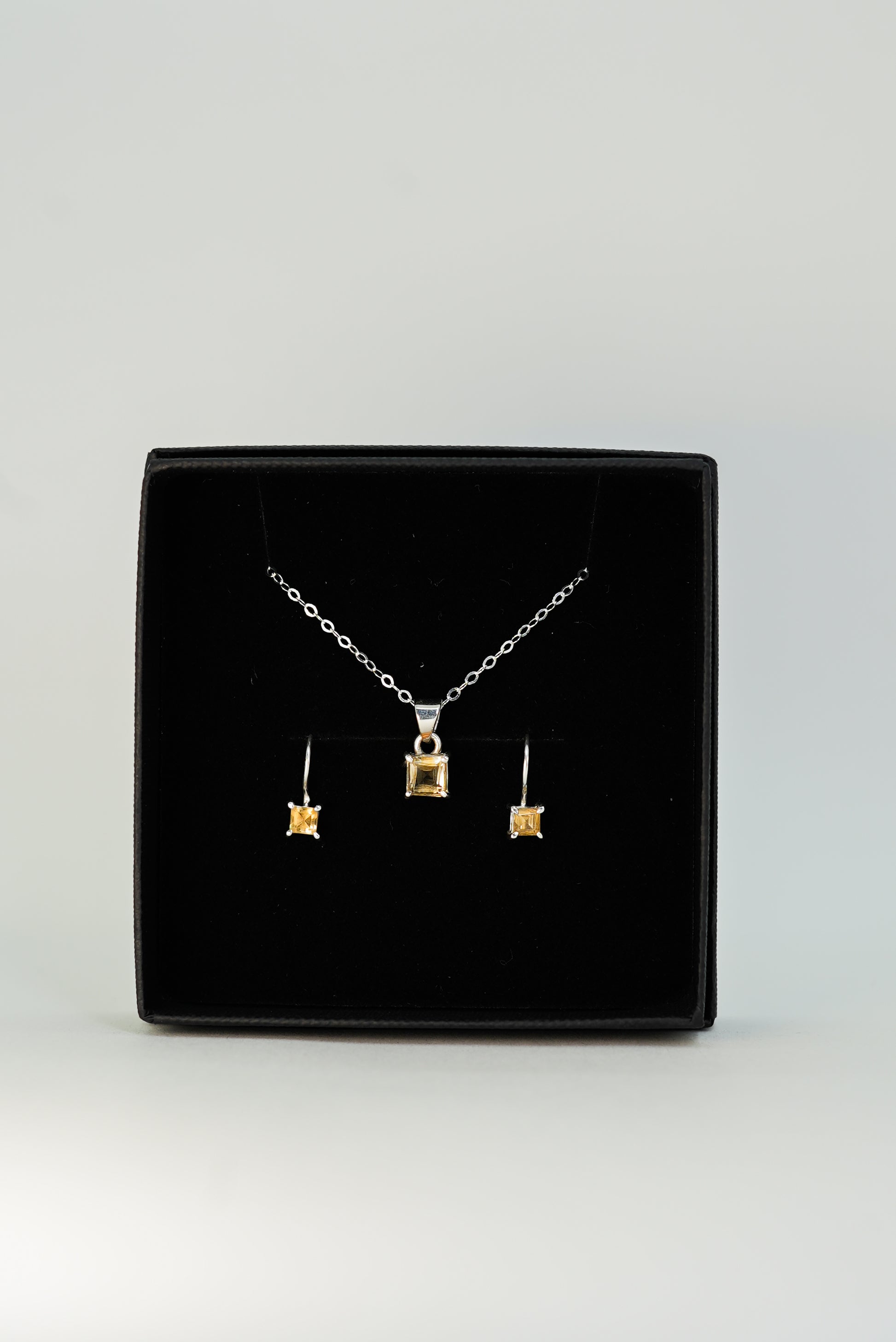Un élégant ensemble composé d’un pendentif et d’une paire de boucles d’oreilles en citrine naturelle, taillée en carré facetté. Montée sur une base en argent massif 925, cette parure séduit par son éclat doré lumineux, symbole de chaleur et de vitalité. Un bijou intemporel qui illumine toutes vos tenues, au quotidien comme en soirée.